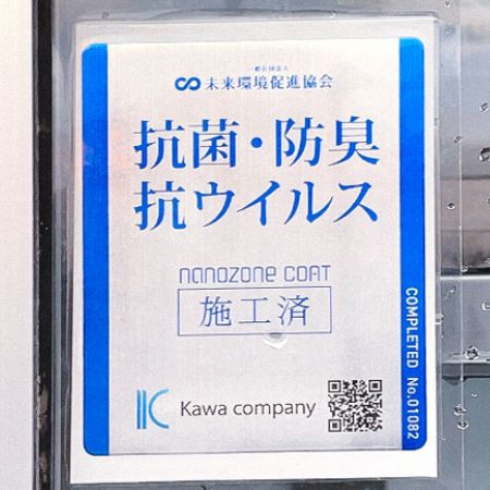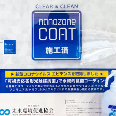 ナノゾーンコートは、2ナノサイズの酸化チタンを使った光触媒の防汚・消臭・抗菌コーティングです。酸化チタンは紫外線を受けると酸化酵素を発生し、菌やウイルス・VOC(揮発性有機化合物)などを水とCO2に分解します。経口毒性も皮膚刺激成分もなく、人体にも環境にも優しく安心な抗菌コーティングです。施工前後で大幅にATP値が下がりました。