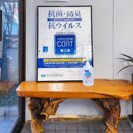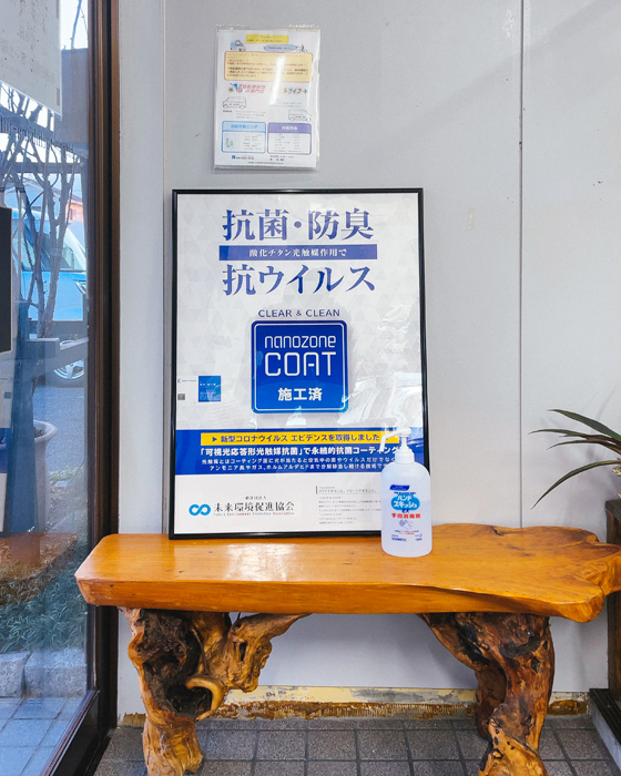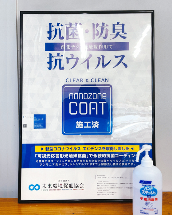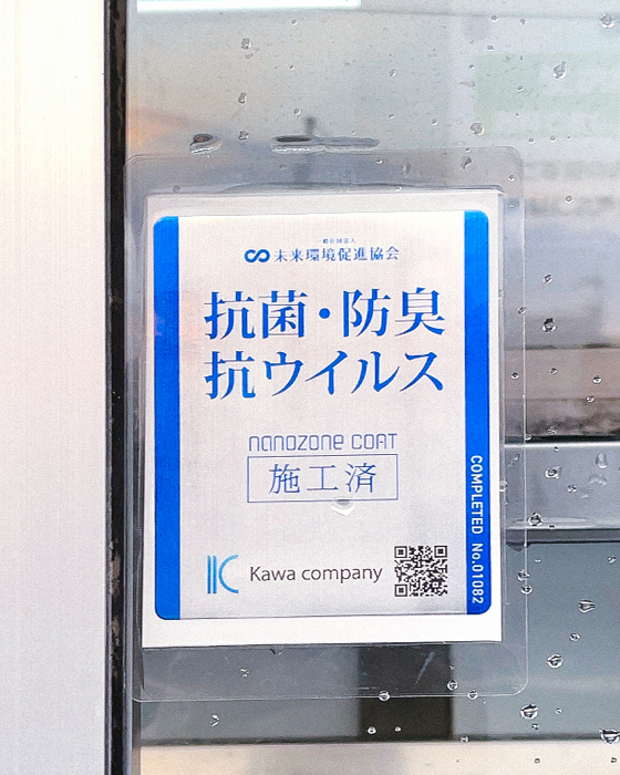 お客さまにより安心して橘とうふしんざぶろうをご利用いただくために、すべての車両の車内、商品陳列棚、店内にナノゾーンコートによる抗ウイルス・抗菌加工を行いました。