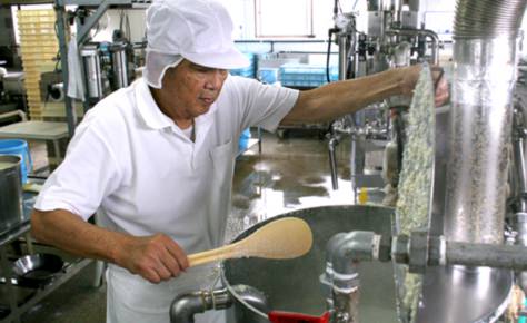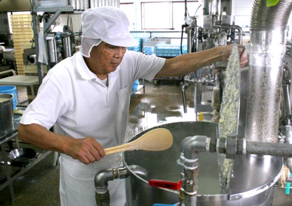 橘とうふしんざぶろうの店舗は工場内にあります。出来たてをそのまま工場内にあるショーケースへ並べています。工場では朝から晩までだいたい4〜5回とうふを作ります、出来たて1〜2時間以内のとうふを一度召し上がってみてください。今まで食べたものとの違いが一番分かります。